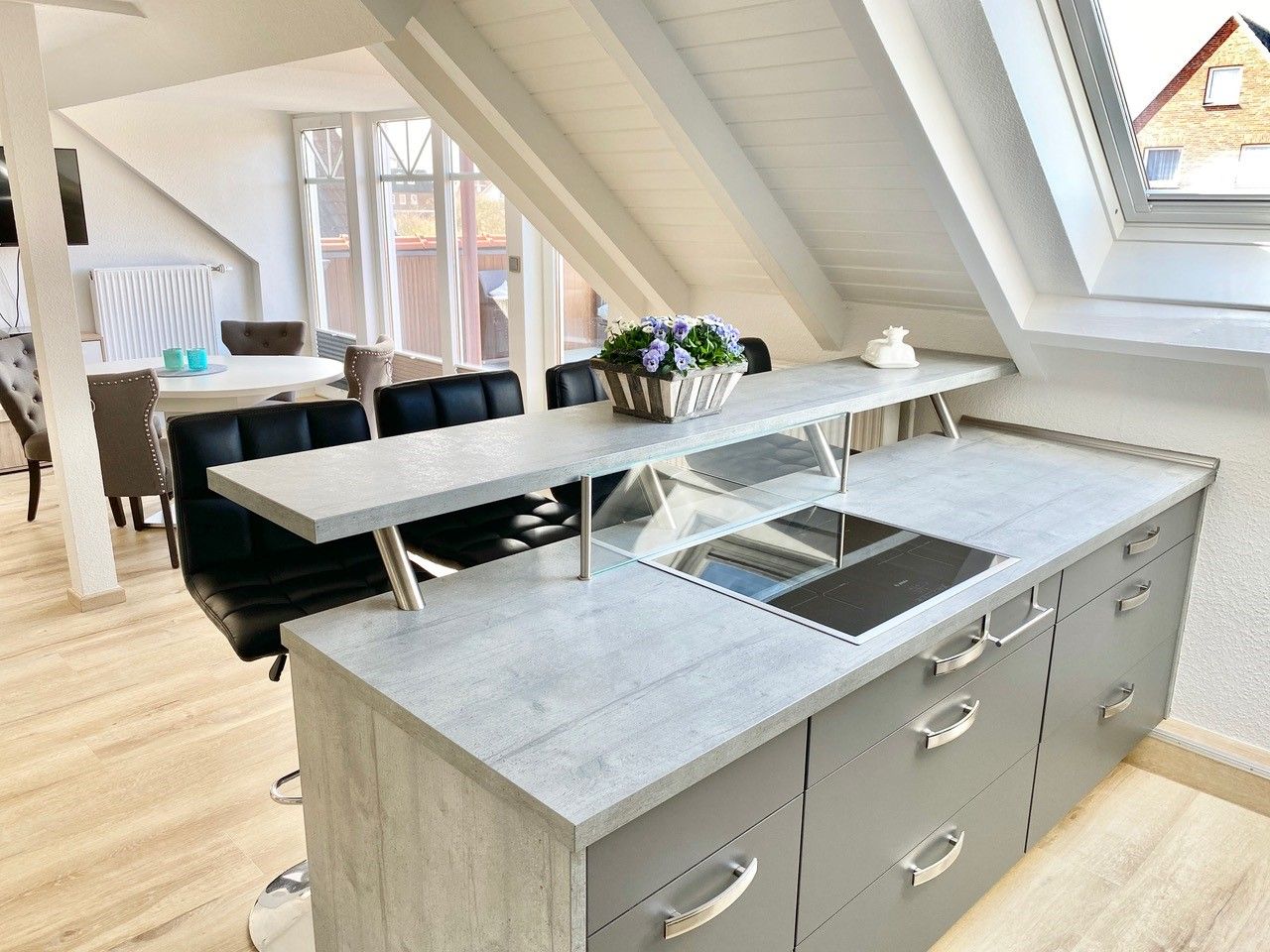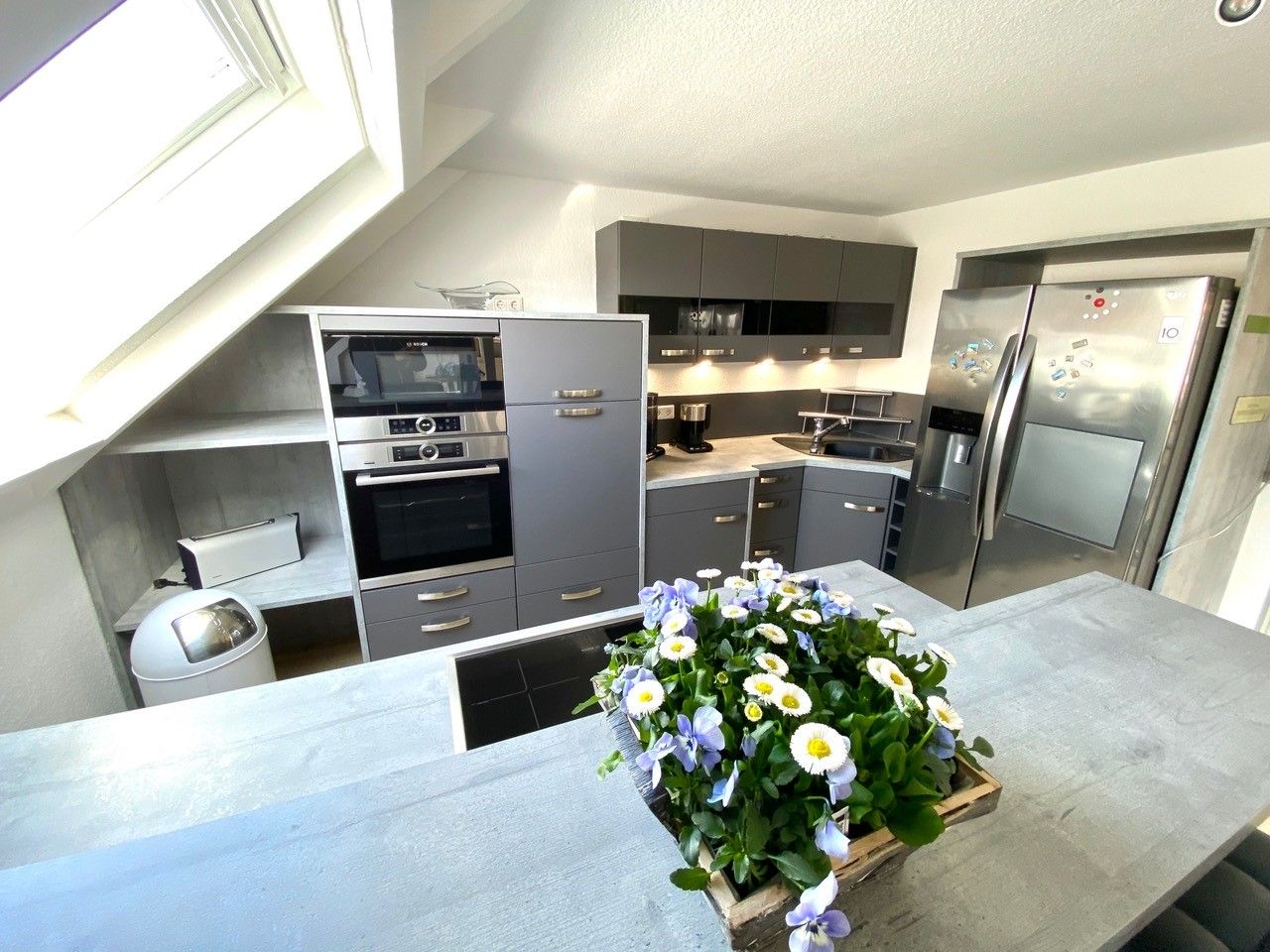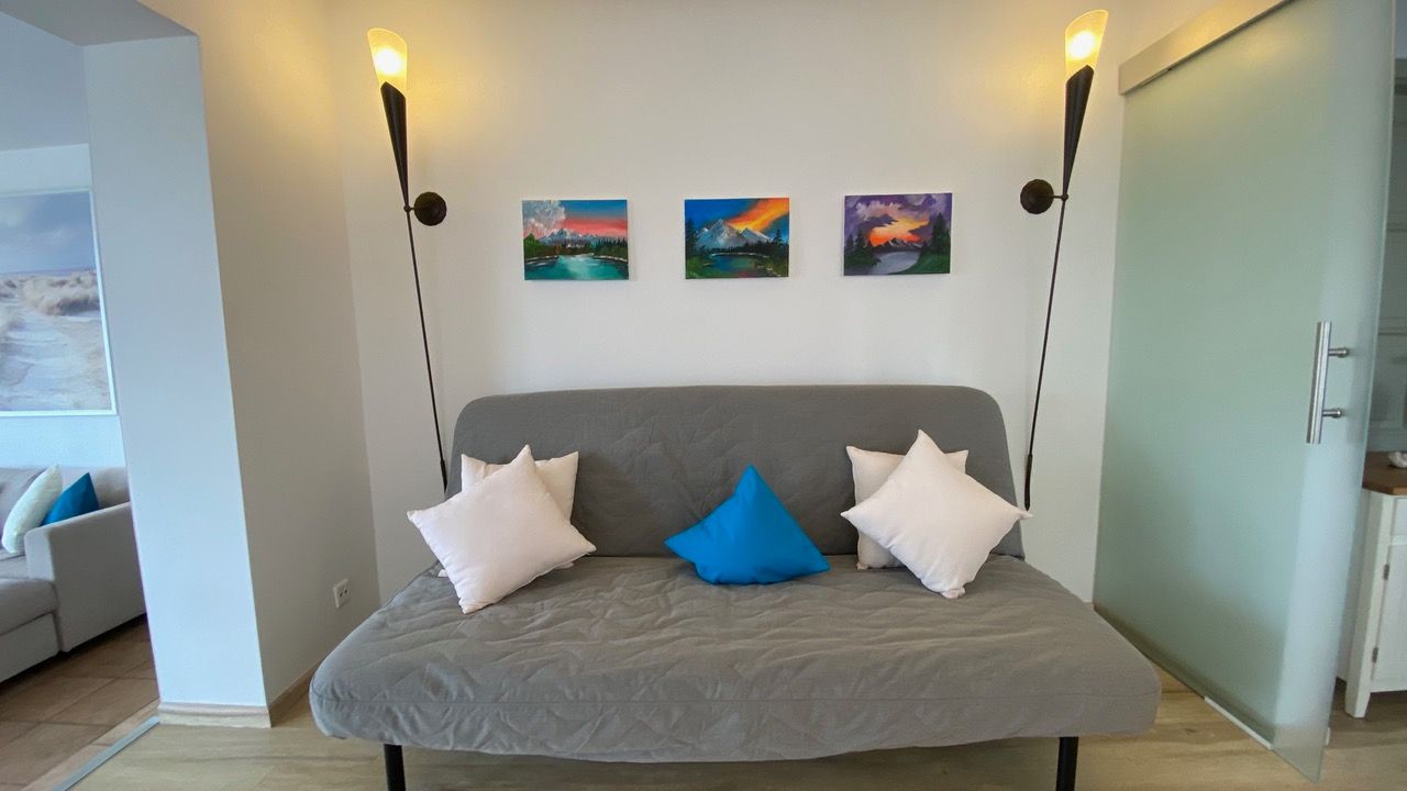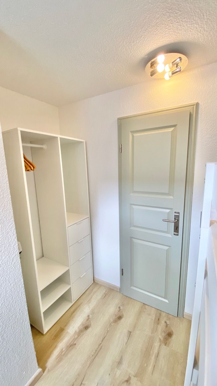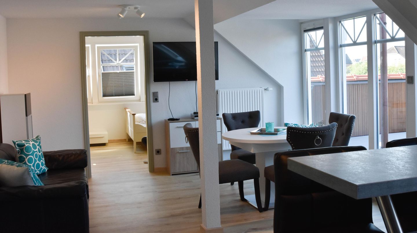 Im Eingangsbereich, bevor Sie über eine freistehende Treppe nach oben gelangen, befindet sich ein Gäste-WC im Eingangsbereich im Erdgeschoß. Der grosszügige Wohn- Essbereich bietet in einem Teil des Raumes eine begehbare offene Küche mit Frühstückstresen und amerkanischem Kühlschrank, die keine Wünsche offen lässt. Im anderen Teil erwartet Sie ein runder Esstisch zum Verweilen, die gemütliche Couchecke mit TV und der tolle Blick auf die schöne möblierte Dachterrasse. Das erste Schlafzimmer hat ein Doppelbett ( 180x200 ). Das zweite 2 Einzelbetten ( 140x200 und 90x200 ).