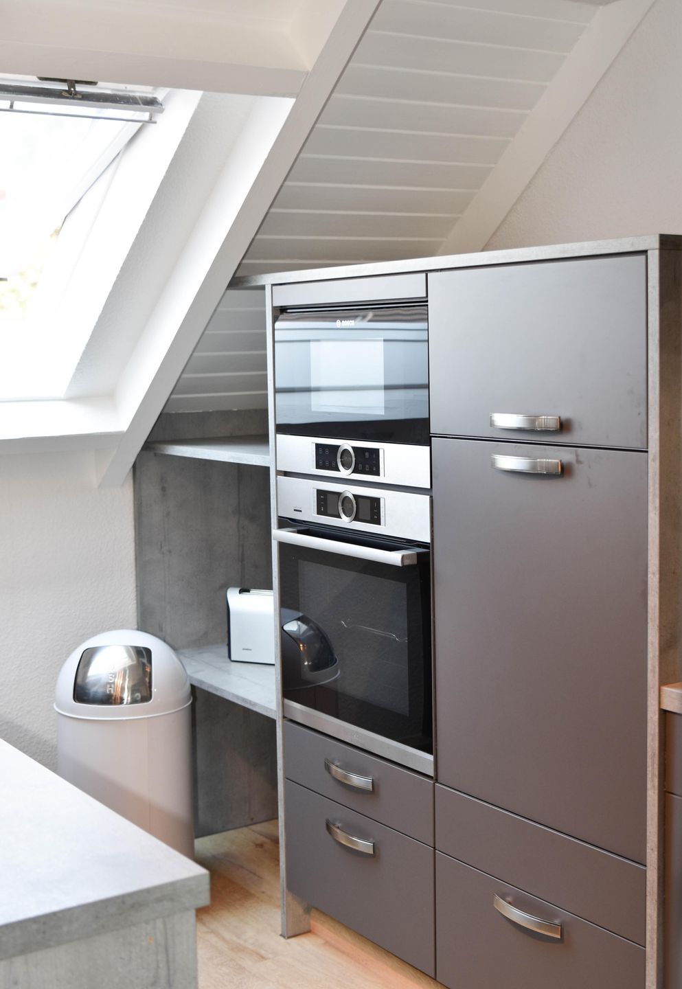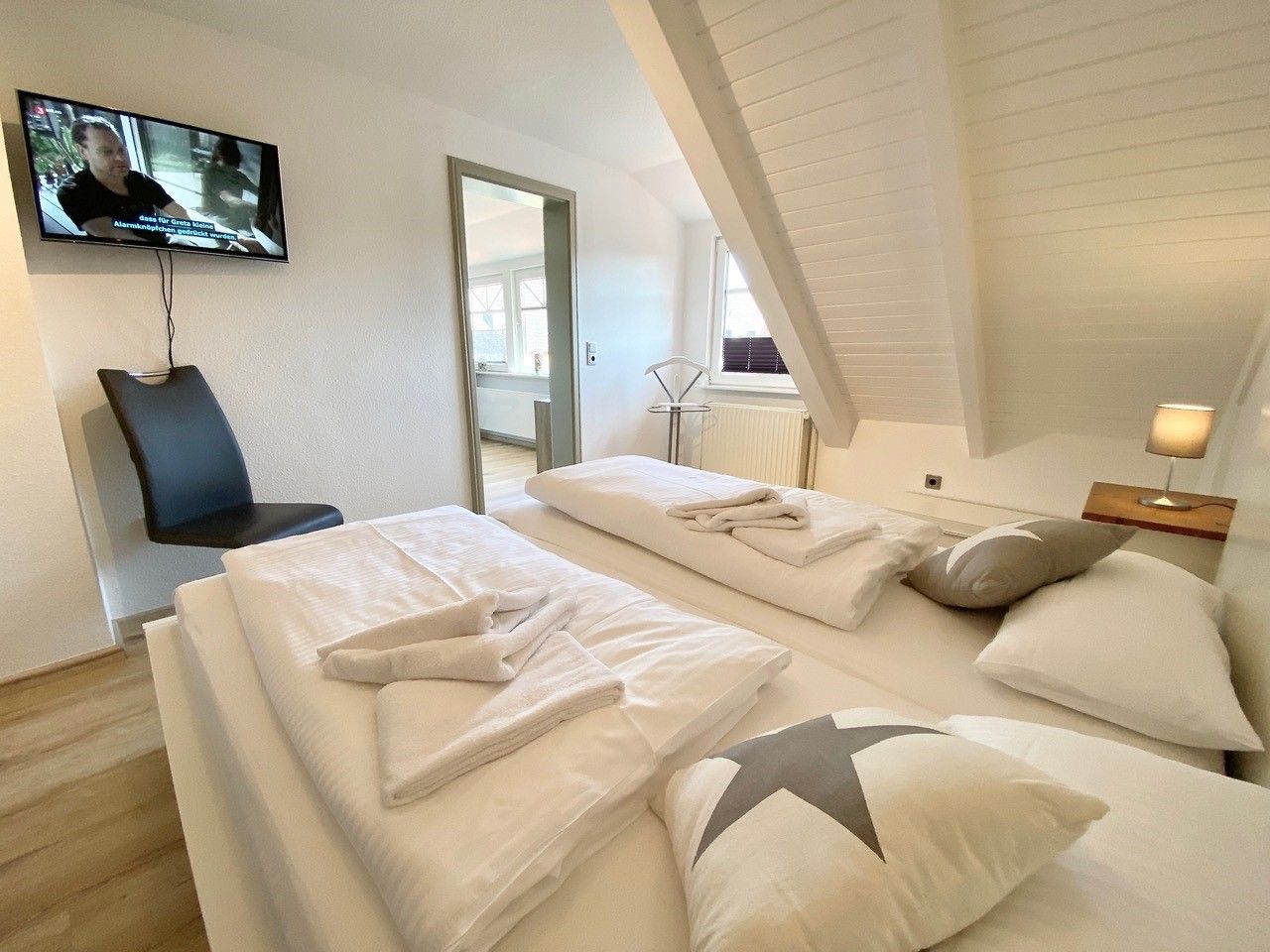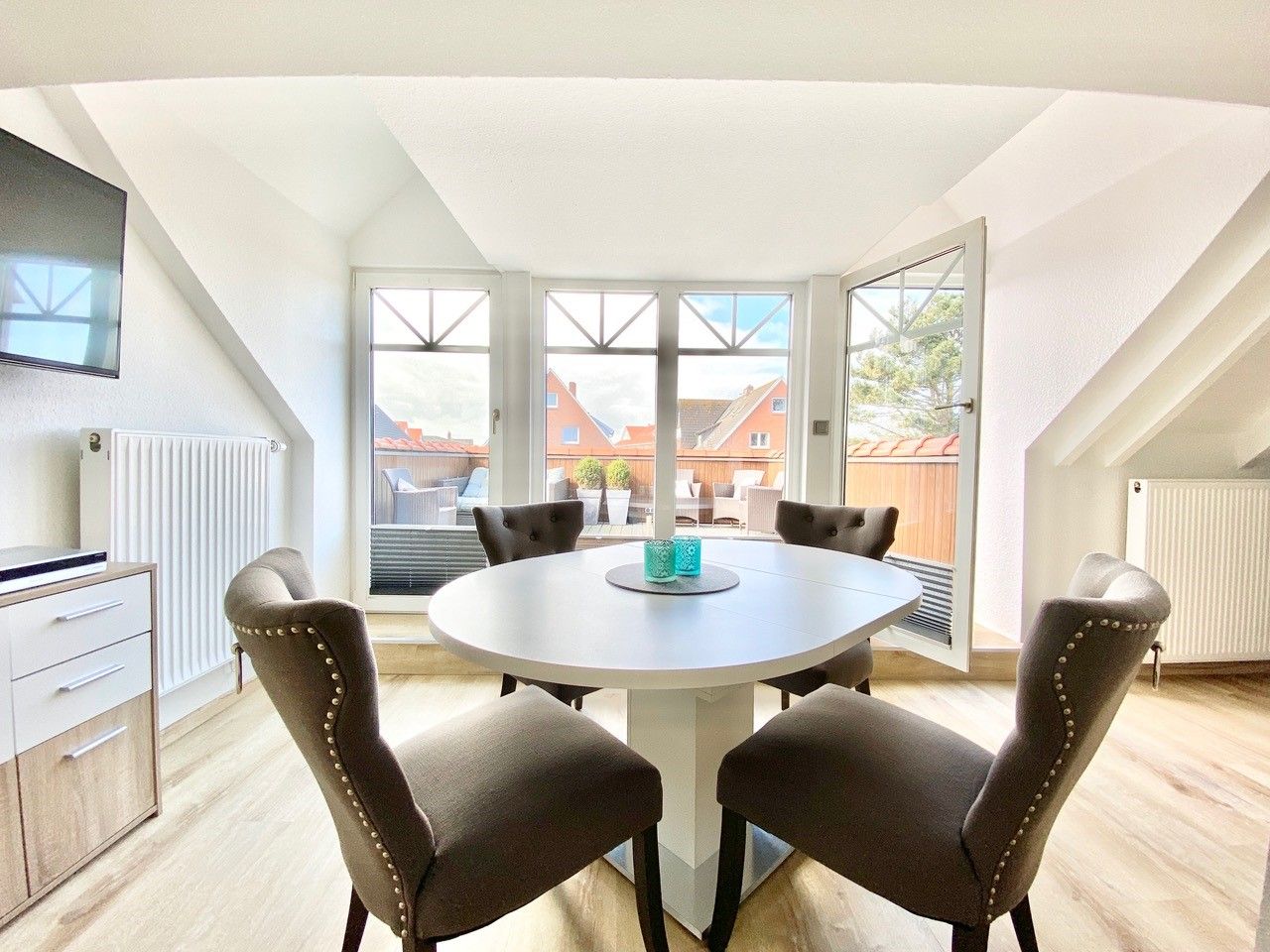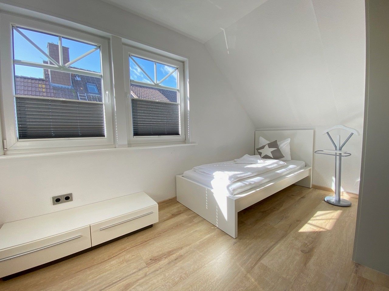 Im Eingangsbereich, bevor Sie über eine freistehende Treppe nach oben gelangen, befindet sich ein Gäste-WC im Eingangsbereich im Erdgeschoß. Der grosszügige Wohn- Essbereich bietet in einem Teil des Raumes eine begehbare offene Küche mit Frühstückstresen und amerkanischem Kühlschrank, die keine Wünsche offen lässt. Im anderen Teil erwartet Sie ein runder Esstisch zum Verweilen, die gemütliche Couchecke mit TV und der tolle Blick auf die schöne möblierte Dachterrasse. Das erste Schlafzimmer hat ein Doppelbett ( 180x200 ). Das zweite 2 Einzelbetten ( 140x200 und 90x200 ).