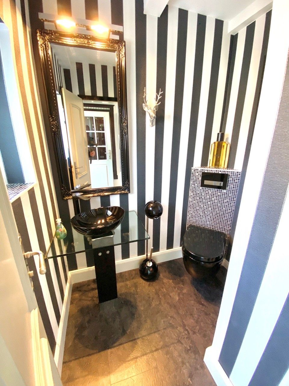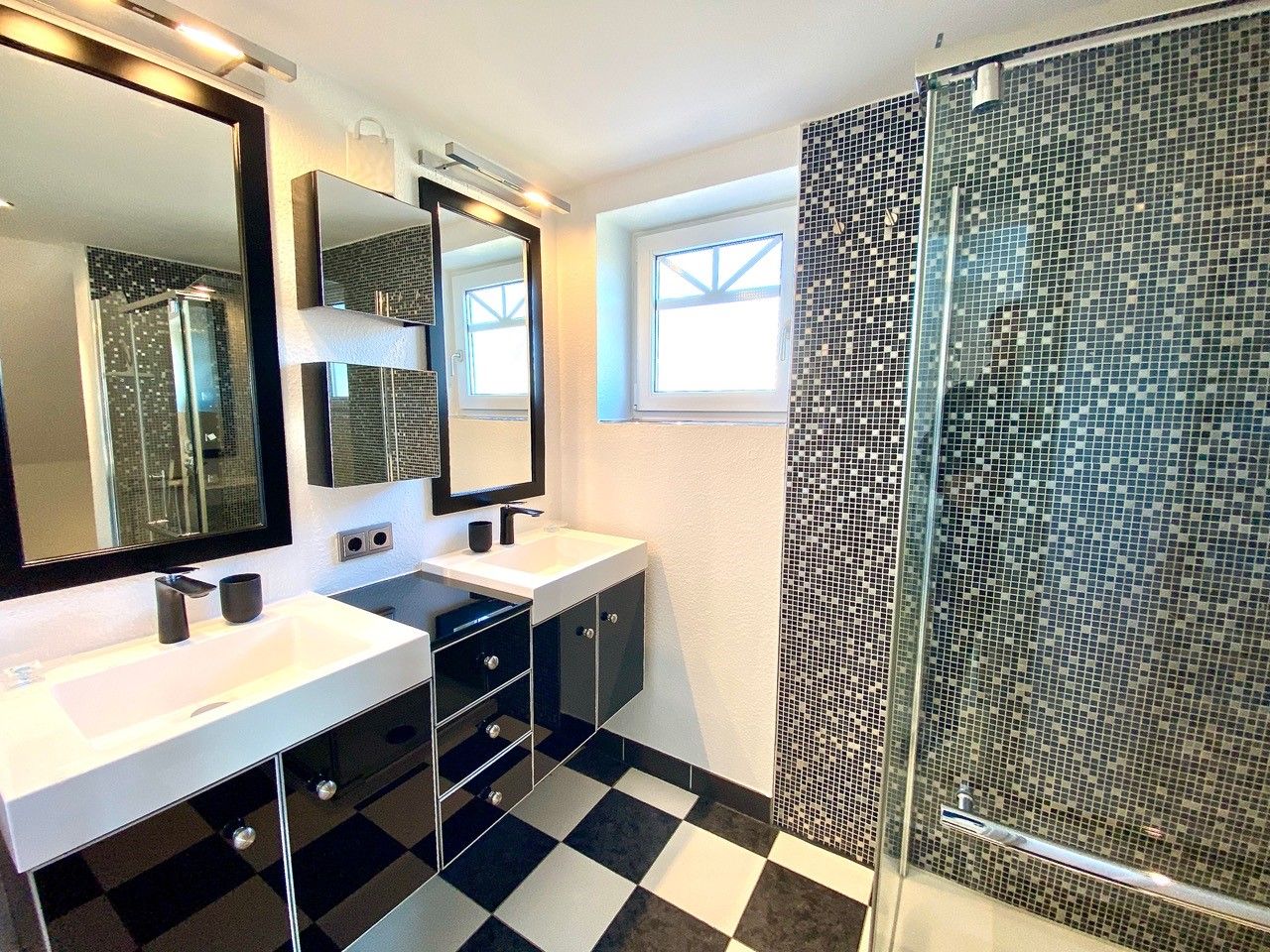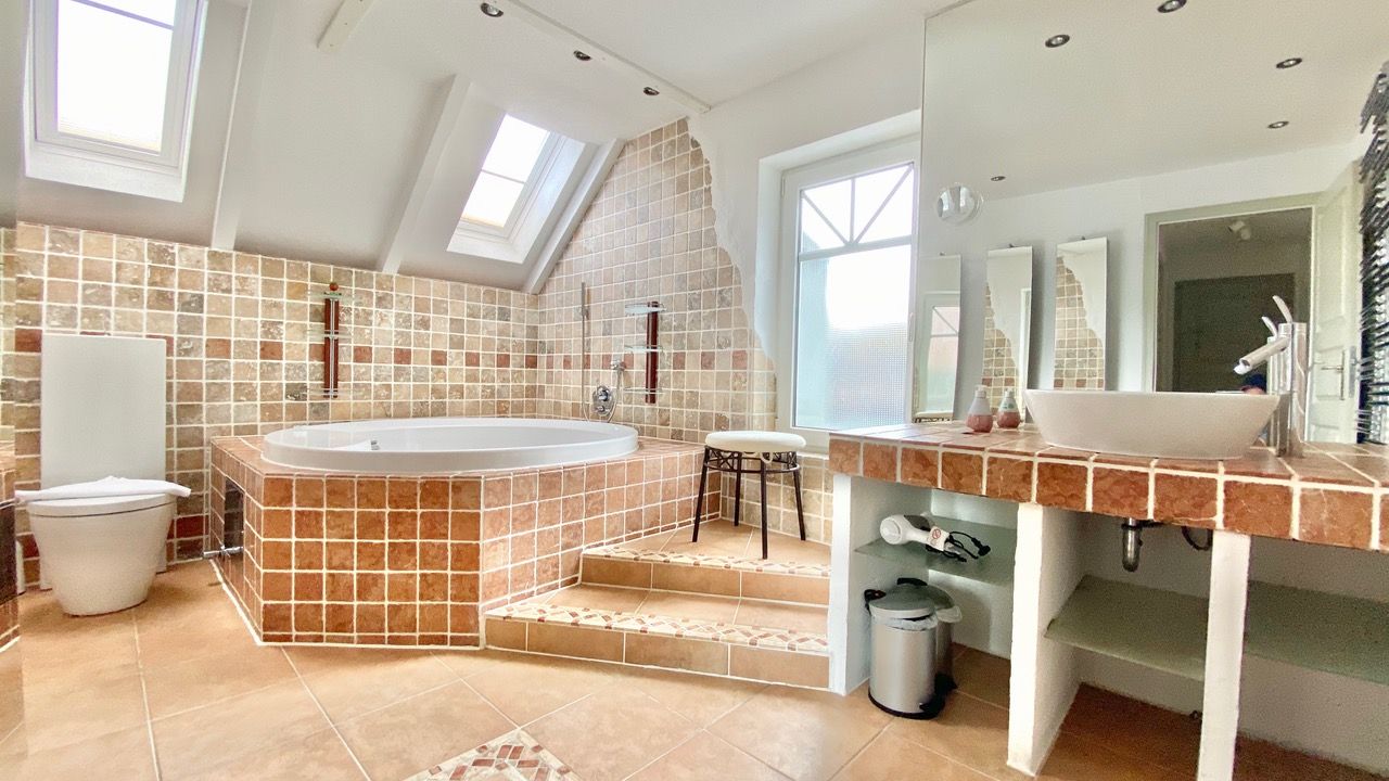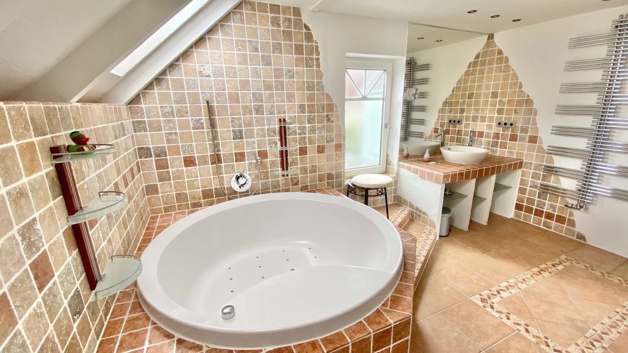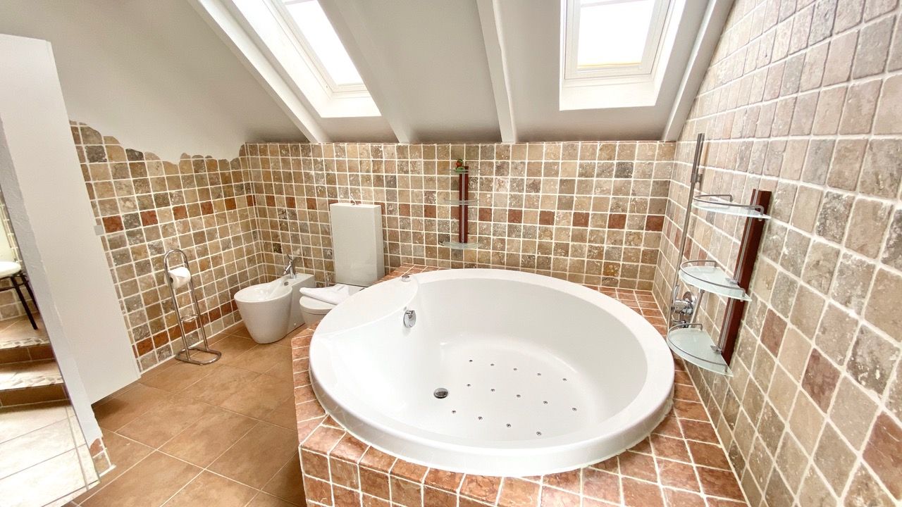 Das stylische Badezimmer hat eine runde Badewanne, ein Doppelwaschbecken, WC und Bidet. In der Wanne haben Sie auch eine Duschvorrichtung.