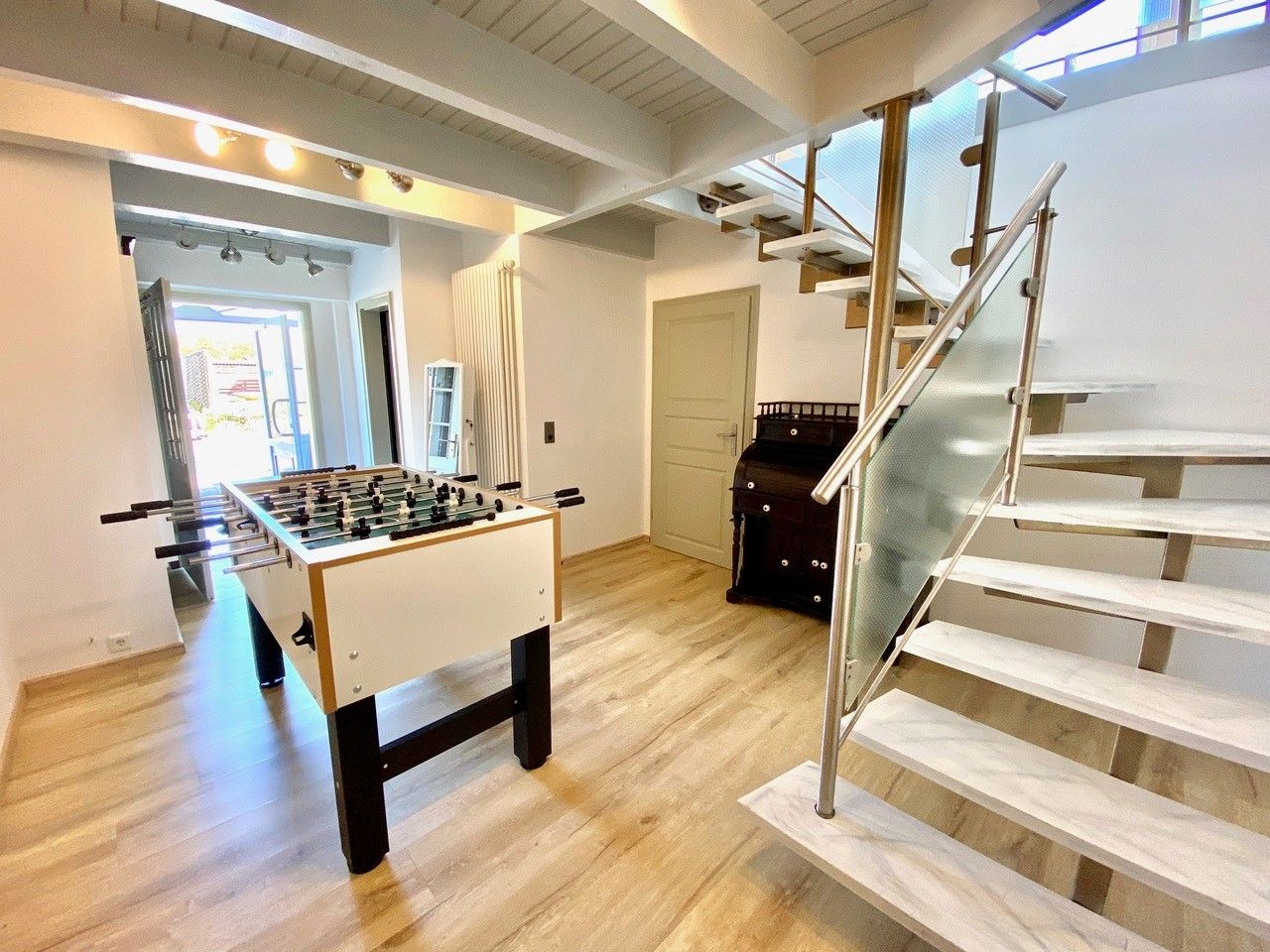 Die beiden Ferienwohnungen sind über, die ansonsten verschlossene seitliche Küchentür zur Flurbereich, dann gemeinsam nutzbar. Die PAULA bietet einen Flügel, der sogar schon einige Male für Proben- oder Musikwochenenden genutzt wurden. Im Flurbereich des Hauses steht Ihnen ein KICKER für gesellige Abende zur Verfügung.