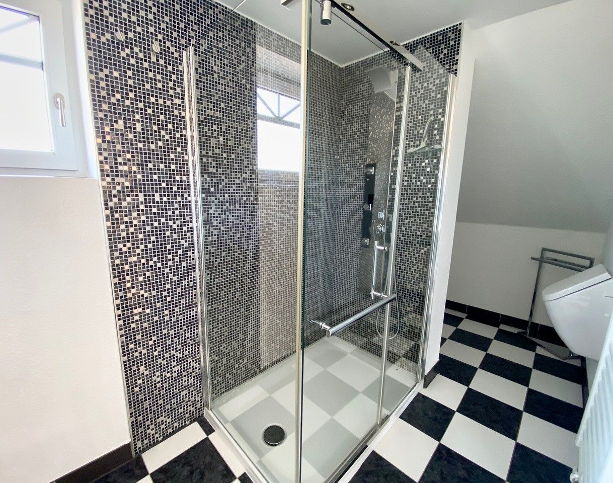 Das lichtdurchflutete, moderne Bad mit ebenerdiger Dusche ist weiterhin mit Waschtisch und optisch, durch einen Mauervorsprung, abgetrenntem WC ausgestattet.