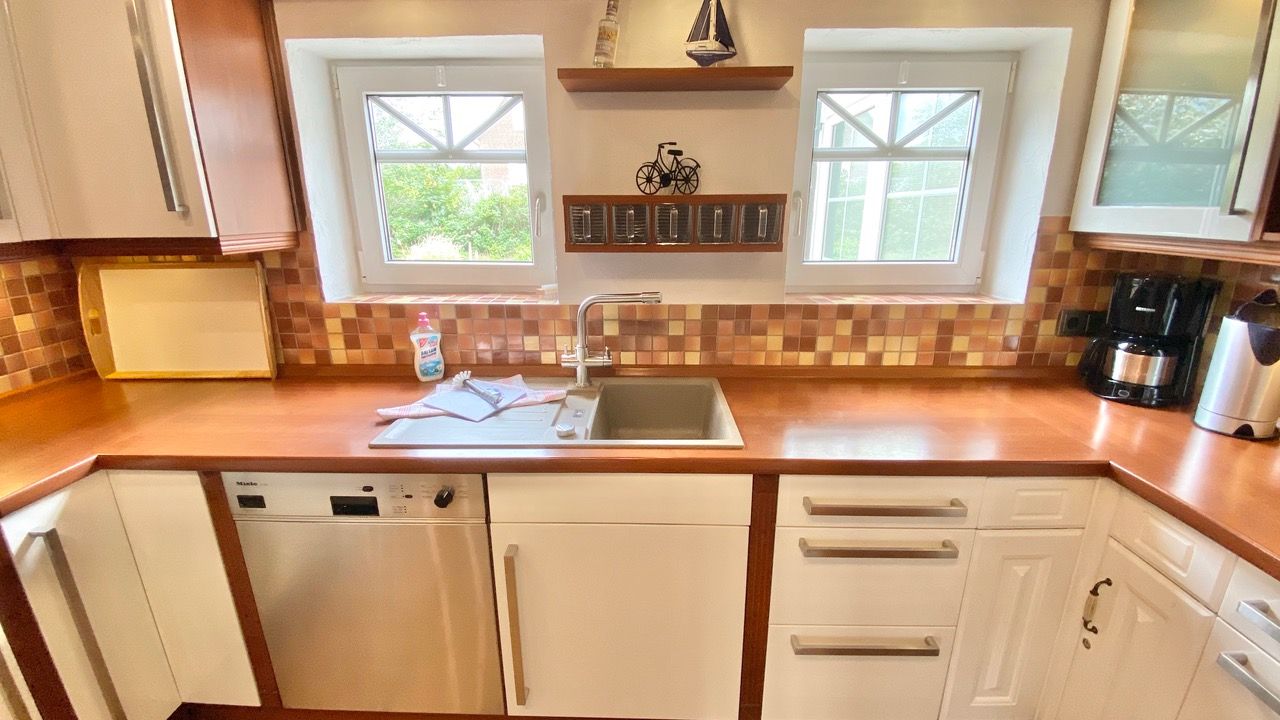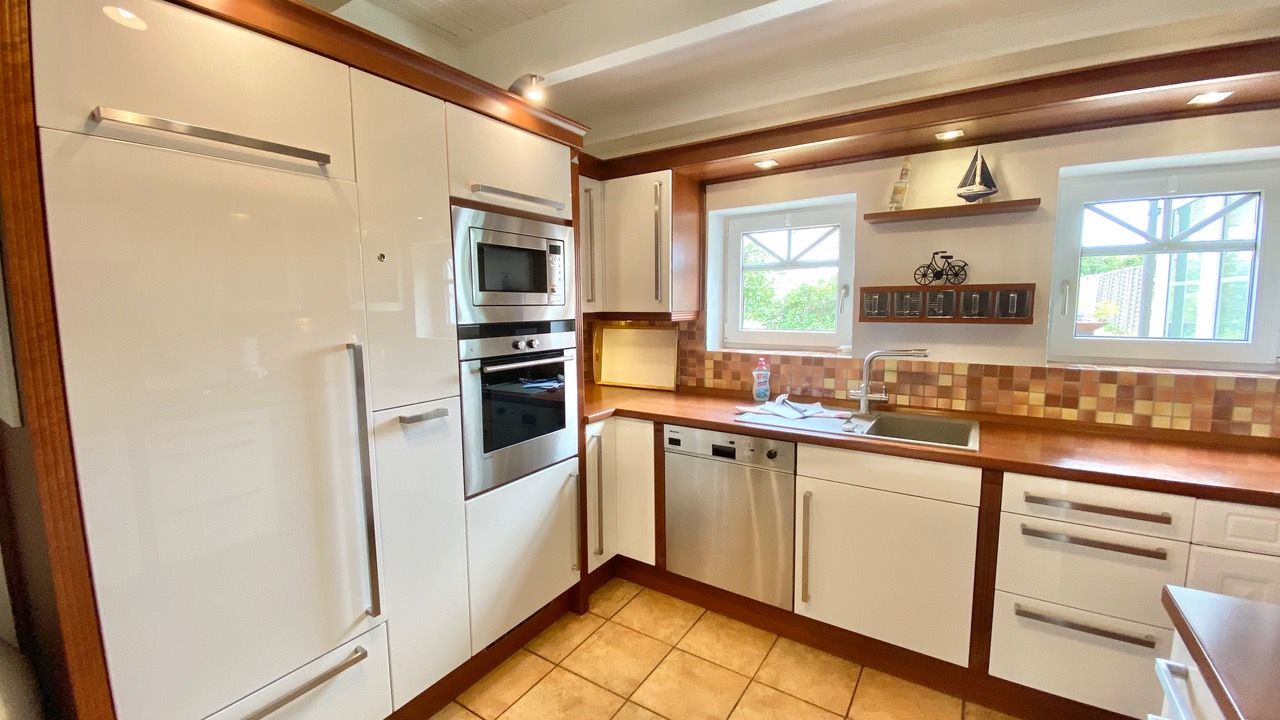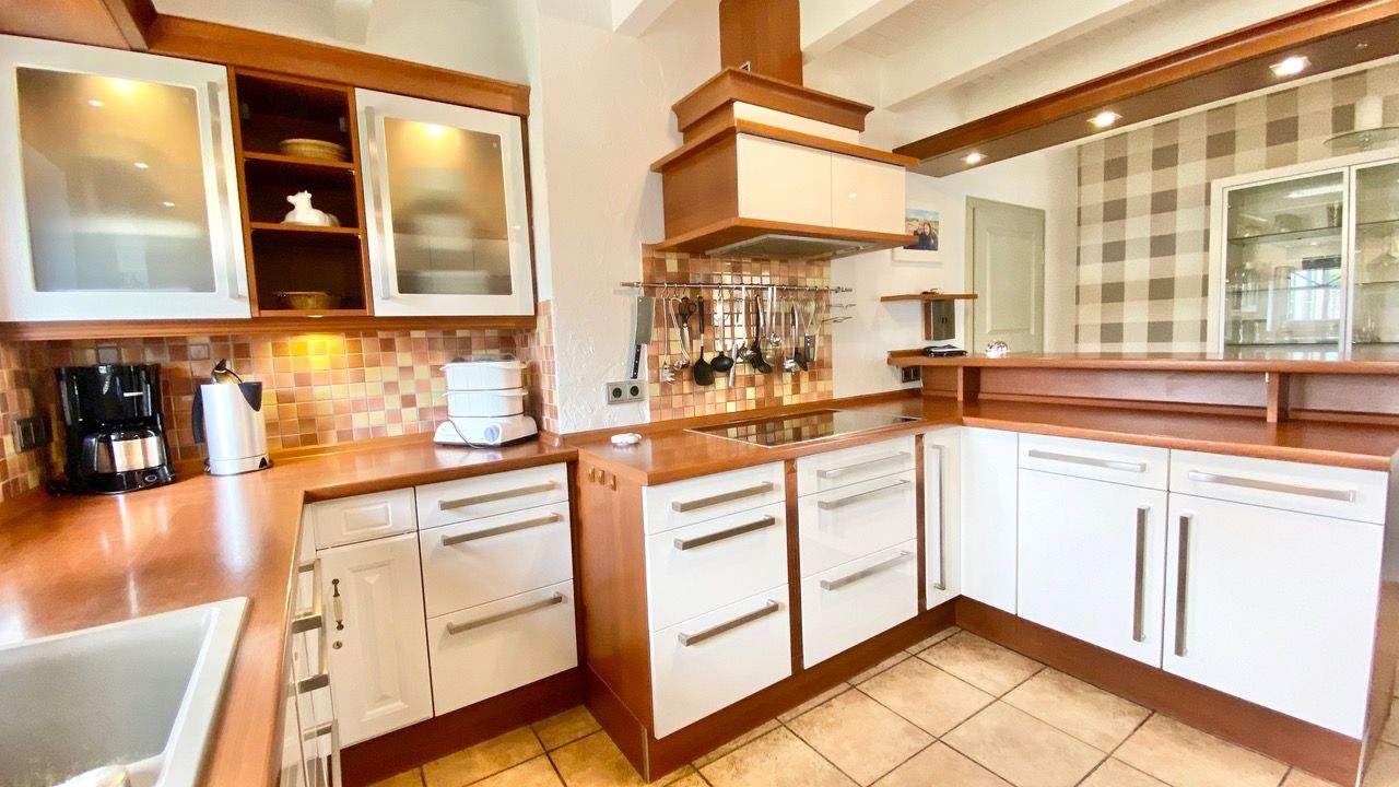 Die große geräumige Küche ist voll ausgestattet und hat einen Tresen für die Snacks zwischendurch.