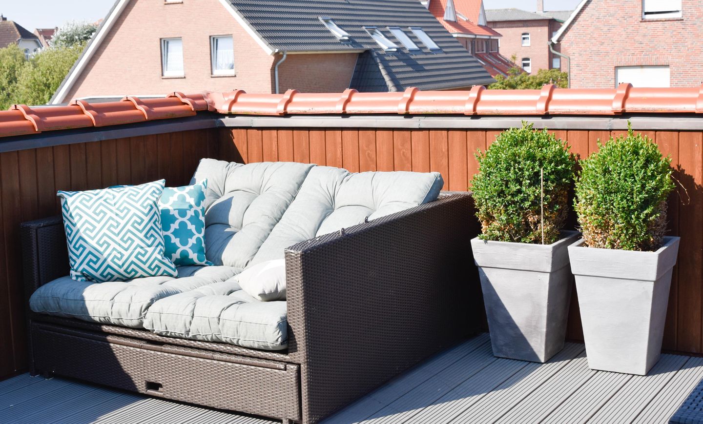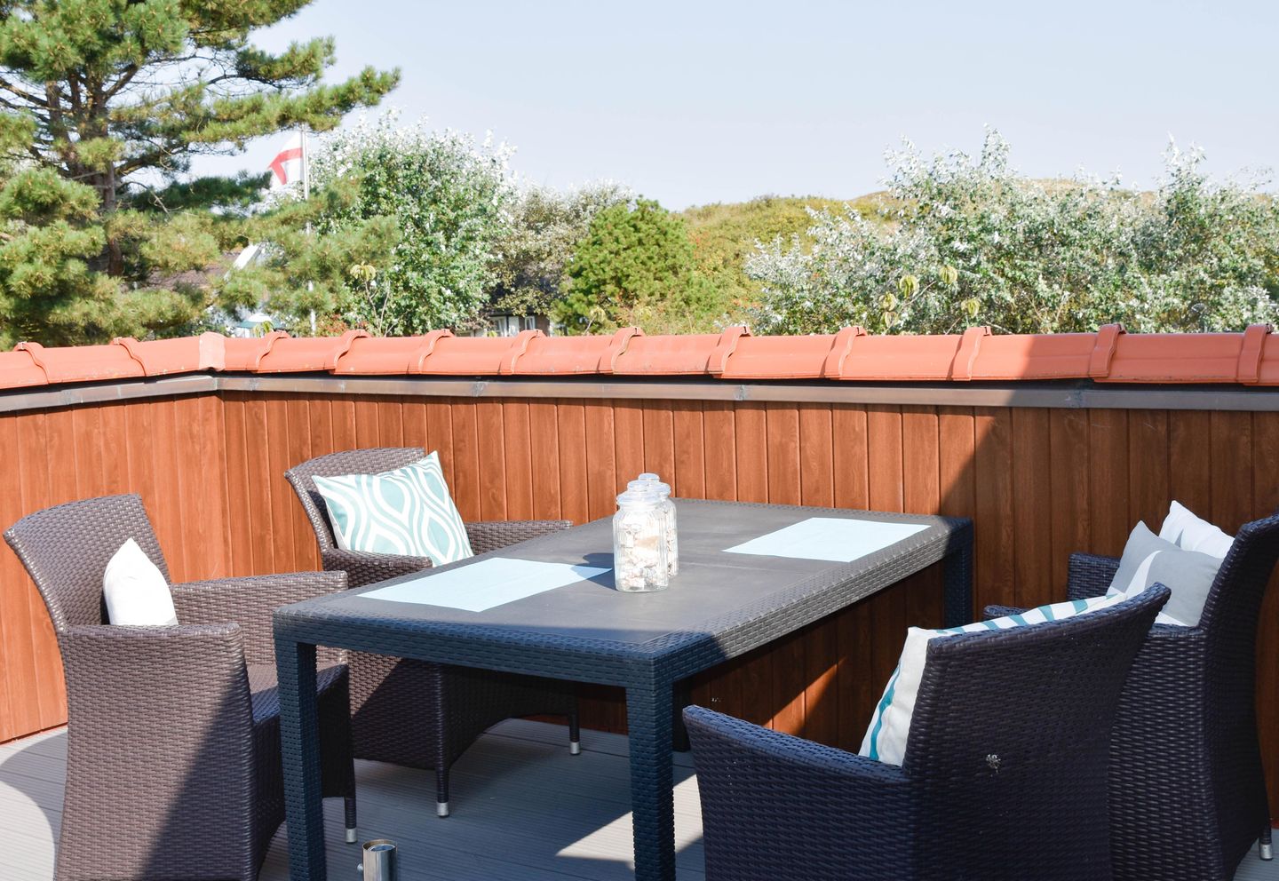 Die tolle Dachterrasse hat einen großen Esstisch sowie einen Sonnenschirm und eine Doppel-Relaxliege um die sonnigen Urlaubstage zu genießen.