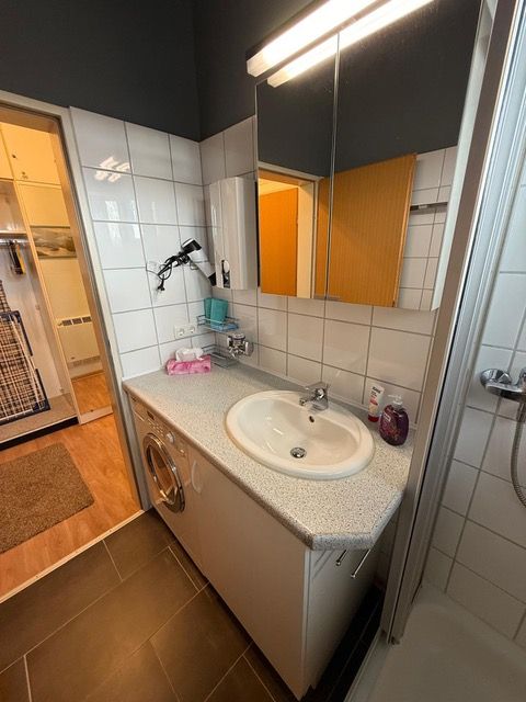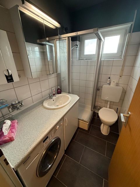 Das helle Duschbad verfügt über Waschtisch mit modernem Spiegelschrank und WC - des Weiteren ist dort auch die Wasch-Trockenkombination untergebracht.