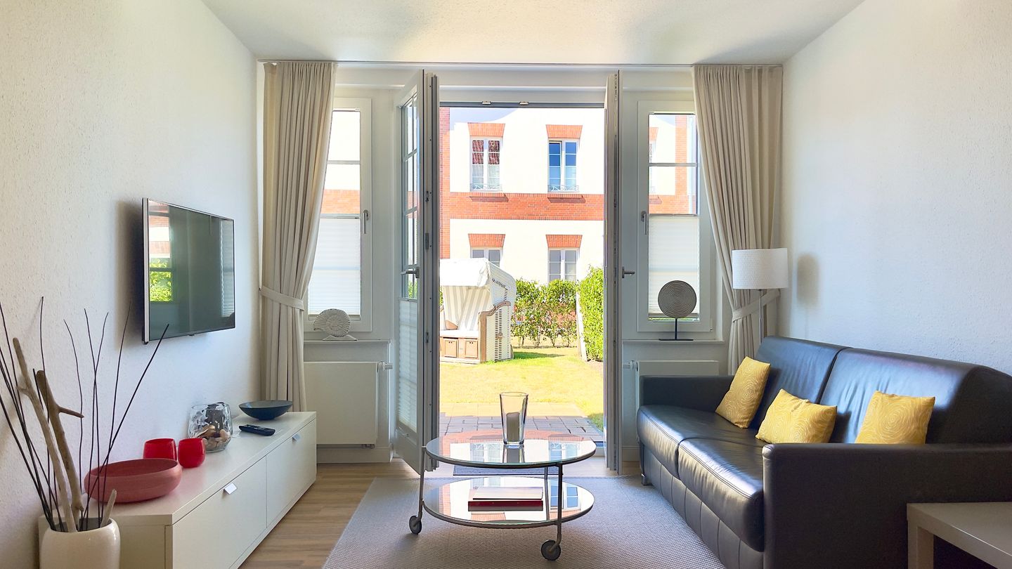 Der anschließende Wohnbereich hat eine gemütliche Couchecke für gemütliche TV-Abende und grenzt an den 60qm großen Gartenbereich mit Strandkorb sowie der bestuhlten Terrasse für laue Sommerabende.