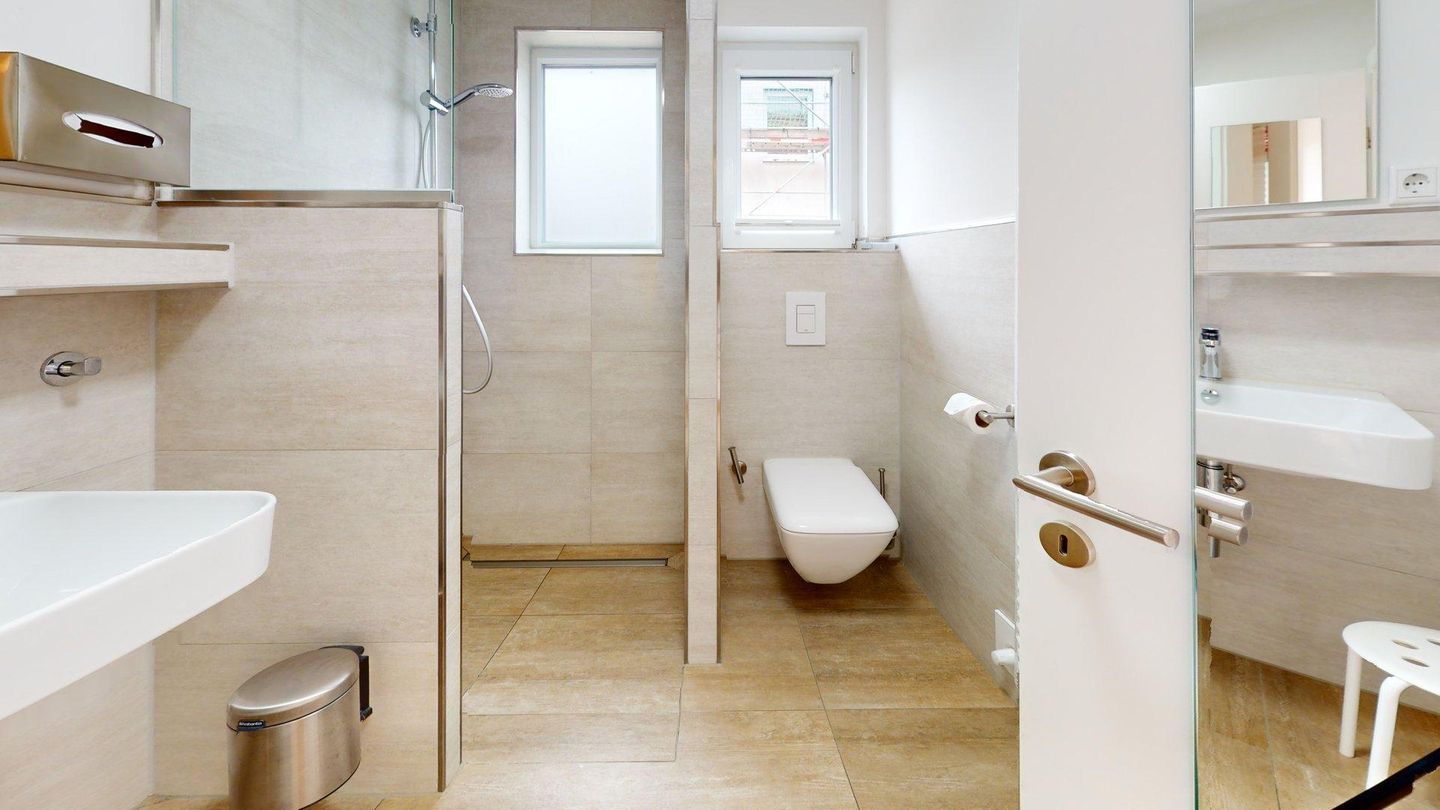 Das Tageslichtbad, mit Fußbodenerwärmung bietet eine begehbare Dusche sowie Waschtisch mit großem Spiegel und WC.