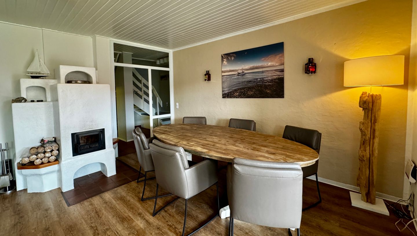 Auf 120 Quadratmetern Wohnfläche erwarten Sie im Inneren des Hauses zwei Bäder (eines mit Dusche, eines mit Badewanne) sowie ein ansprechender Wohn- und Essbereich in edel-puristischem Stil mit viel Weiß und maritimen Anklängen. Winterabende in Ihrem Urlaub auf Langeoog verbringen Sie dort sicher gern vor dem gemütlichen Kaminofen.