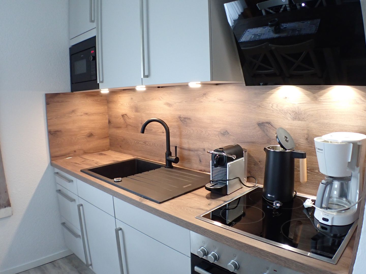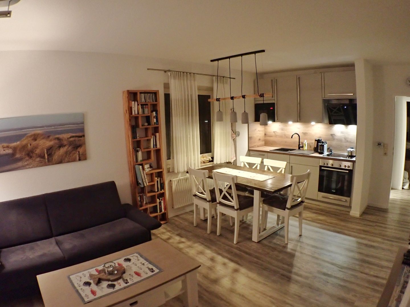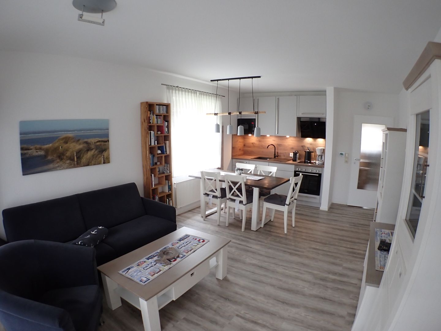Das Wohnzimmer verfügt über eine Schlafcouch und kann vollständig abgedunkelt werden, sodass insgesamt bis zu sechs Personen in dieser FeWo auf Langeoog übernachten können. In der gut ausgestatteten Küche finden Sie einen vierflammigen Herd mit Ceranfeld und Backofen sowie einen Tischgrill, ein Raclettegerät, eine Mikrowelle, einen Wasserkocher und eine Kaffeemaschine. Die Ausstattung umfasst des Weiteren ein Babybett und einen Hochstuhl für Ihre Kleinsten, kostenloses WLAN und Telefonieren ins deutsche Festnetz, einen Flachbildfernseher sowie einen Blu-ray-Player. Urlaubslektüren, Kinderspielzeug und Gesellschaftsspiele ergänzen unser Angebot. Bei Bedarf können Sie die Waschmaschine und den Trockner im Speicher nutzen.