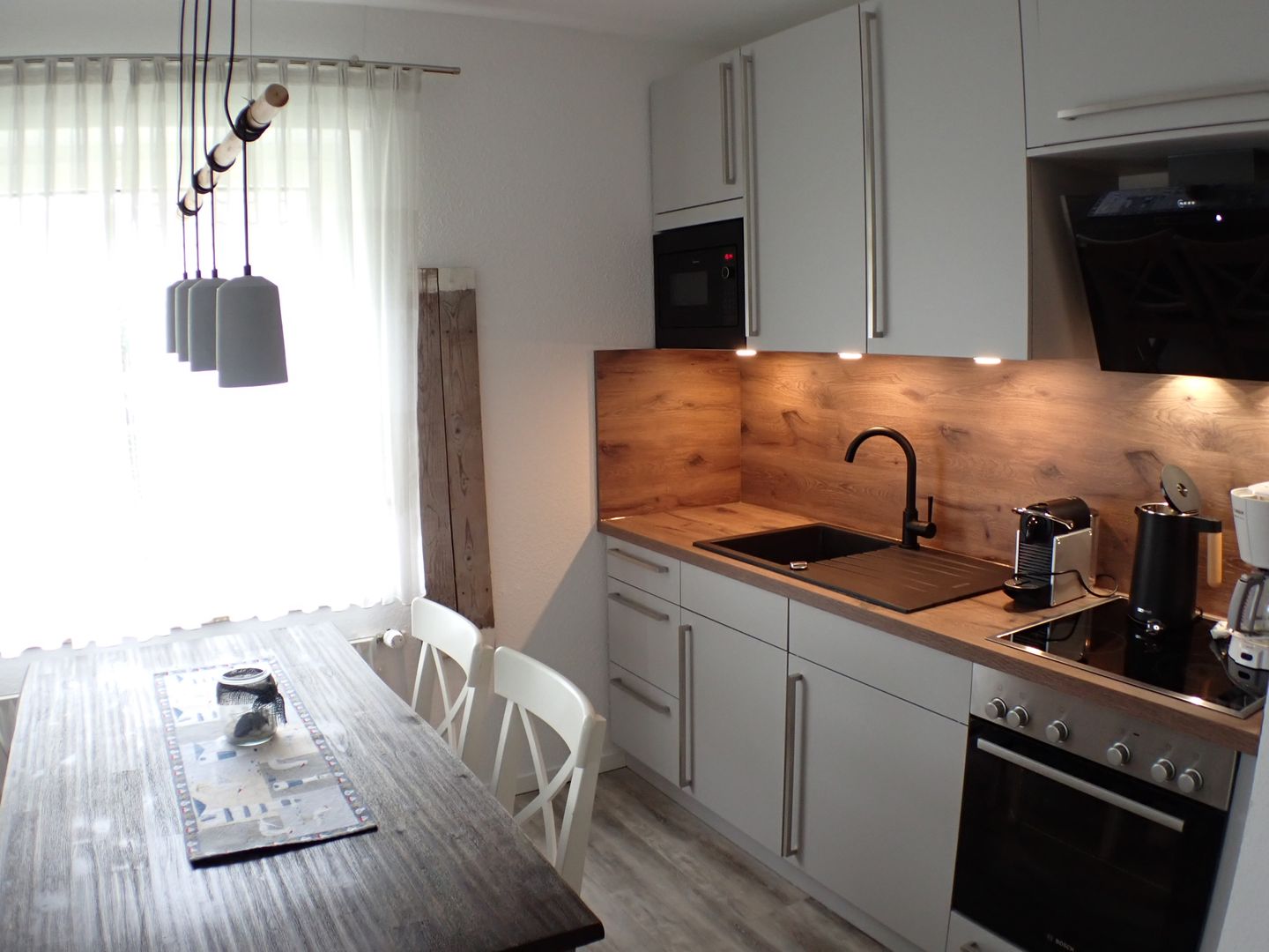 Die Ferienwohnung hat zwei Schlafzimmern mit Doppel- und Etagenbett, einem geräumigen Wohn-/ Küchenbereich, einem Badezimmer und einem Südbalkon.