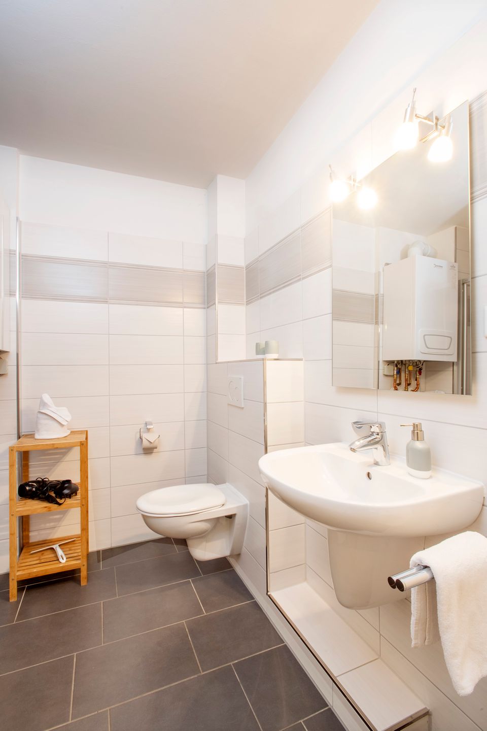 Das 'TWILLINGHUS 2' begeht man durch den Flurbereich mit Garderobe und Schuhschrank - die danach angrenzende, vollausgestattete Küche geht über in den Essbereich und die gemütliche Couchecke mit TV - hier gelangt man auf den gemütlich, bestuhlten Balkon mit Blick auf unseren schönen Wasserturm. Des weiteren gibt es ein separates Schlafzimmer mit Doppelbett und zwei zusätzliche Schlafplätze auf der Schlafcouch im Wohnzimmerbereich. Das helle, moderne Bad bietet eine Dusche mit Glaskabine sowie Waschtisch und WC.