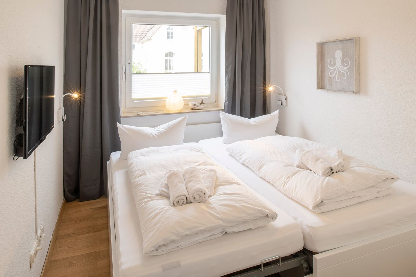 Zwei schöne, helle Schlafzimmer bieten behaglichen Schlafkomfort – mit einem Doppelbett bzw. einem Einzelbett, das sich bei Bedarf zu einem Doppelbett ausziehen lässt. Viel Stauraum, freundliche Farben und eine ruhige Lage sorgen für erholsame Nächte.